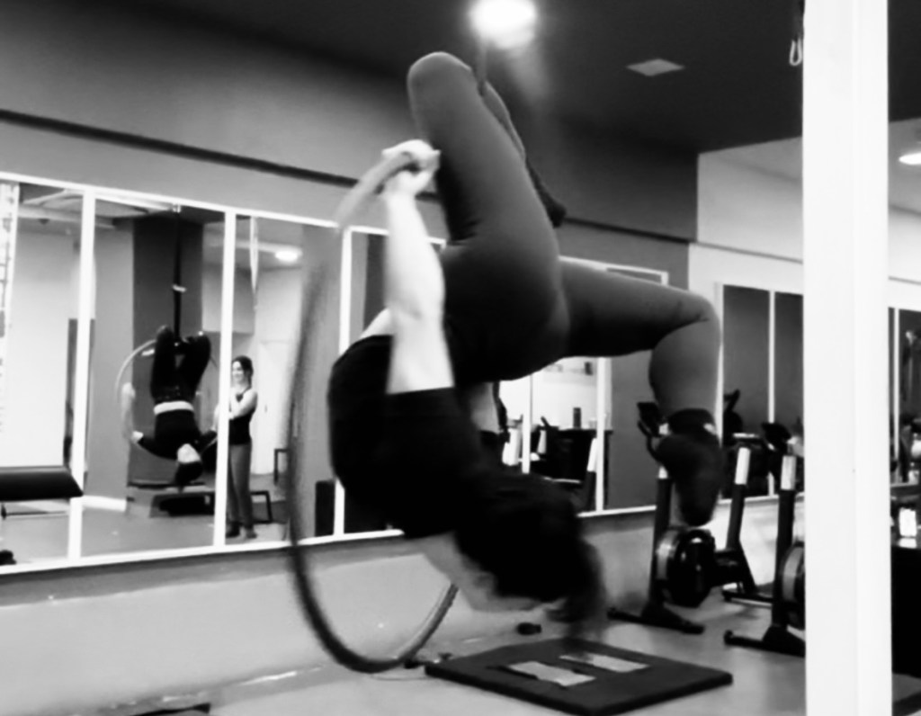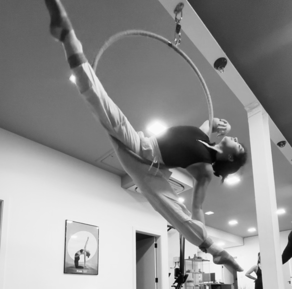 The aesthetic of aerial hoop encourages a rotational component where the dancer enters in the hoop and initiates its spin. Since the rigging point is connected to the hoop with a swivel, the hoop spins freely. The aeralist must resist the centrifugal force created by rotation, adding an increased demand for postural stability (Dongaz et al., 2024).