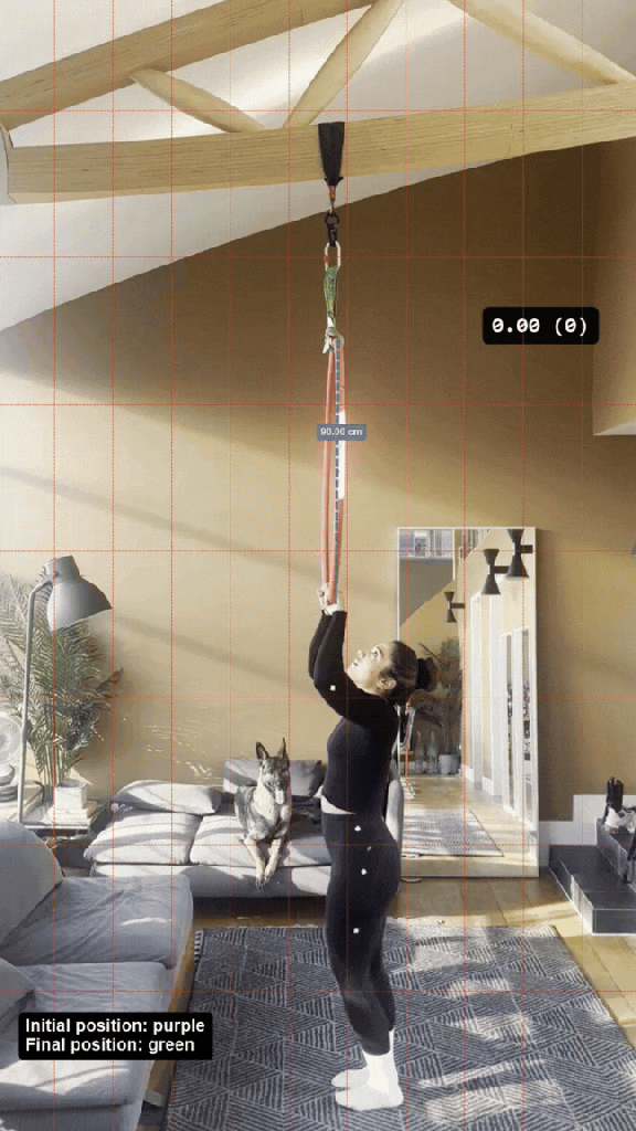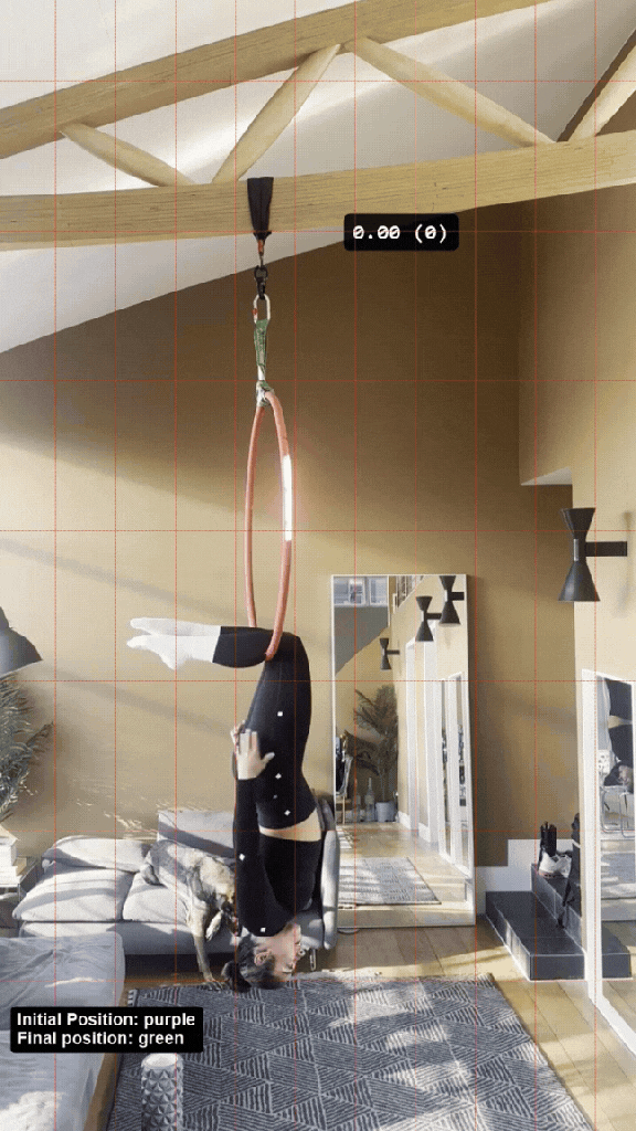 Aerial arts demand a greater capacity for upper body strength than other forms of artistic movement practices (Dongaz et al., 2024). The aerialist must coordinate strength and mobility to manipulate their bodies within the hoop. Notably, as the Tanya lifts her feet from the ground (Video 1.) she takes her full body weight into their hands and controls its movement up and down with their arms (Fig 1). Any deviation of center of mass on the horizontal plane (usually forward or backward) increases the force demand on the aerialist’s arms as they resist motion. We can suggest that the aerialist should reduce swinging on the horizontal plane in order to execute movements more efficiently.